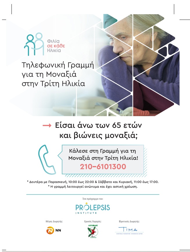 Επιπλέον, στο πλαίσιο του προγράμματος, λειτουργεί η Τηλεφωνική Γραμμή για τη Μοναξιά στην Τρίτη Ηλικία – 2106101300, η οποία στελεχώνεται από εθελοντές. Στη γραμμή, μοναχικά άτομα μεγαλύτερης ηλικίας, αλλά και οι συγγενείς/ φροντιστές τους, μπορούν να καλούν ανώνυμα και να λαμβάνουν “ανθρώπινη επαφή” και επικοινωνία.