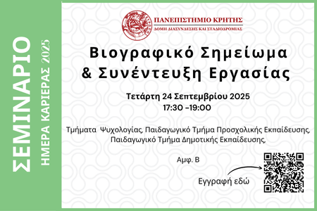 Στο πλαίσιο της Ημέρας Καριέρας 2025, η Δομή Διασύνδεσης και Σταδιοδρομίας του Πανεπιστημίου Κρήτης διοργανώνει σεμινάριο με θέμα:
