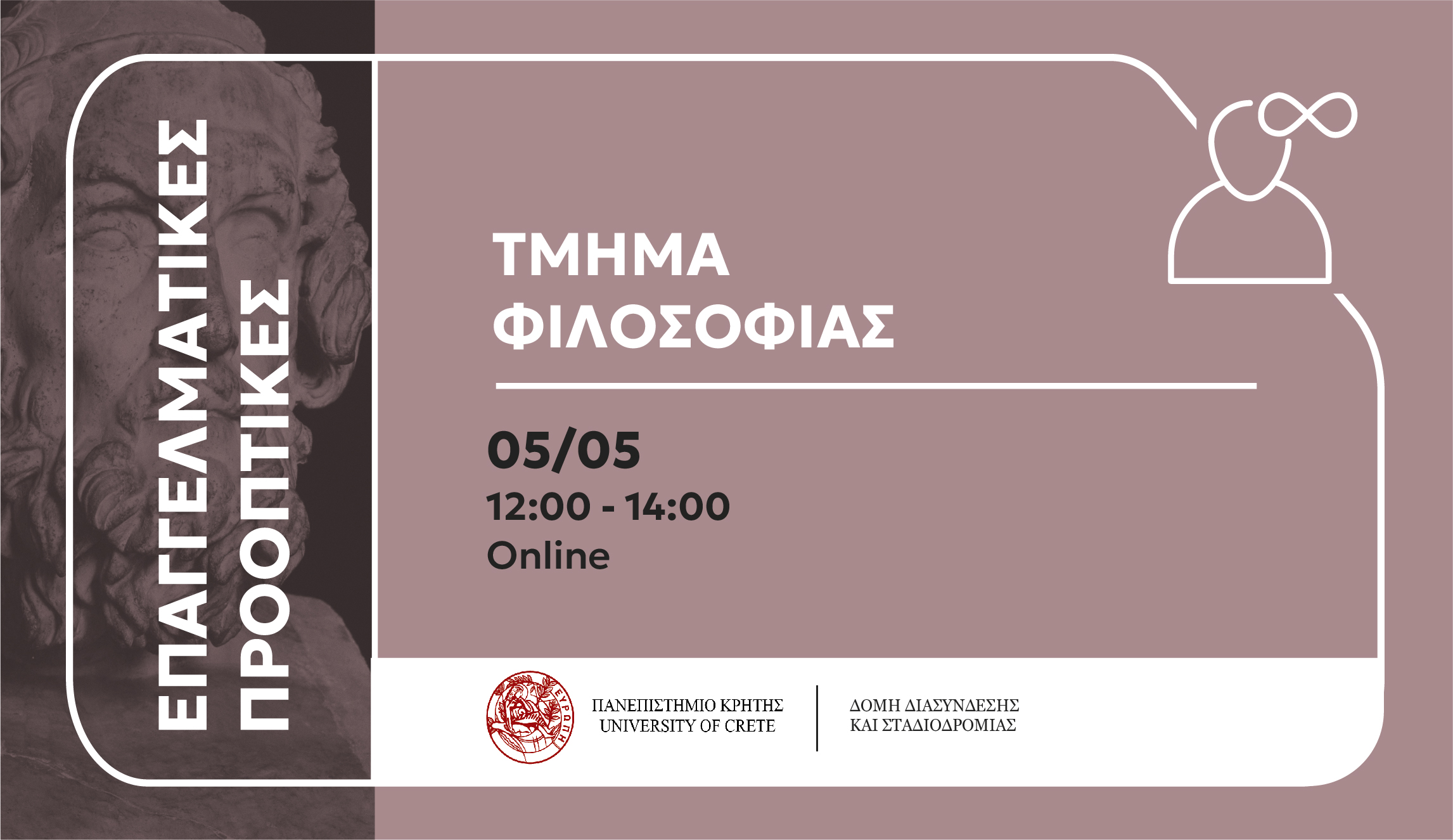 Το Τμήμα Φιλοσοφίας και η Δομή Διασύνδεσης και Σταδιοδρομίας του Πανεπιστημίου Κρήτης σας προσκαλούν σε διαδικτυακή εκδήλωση με θέμα τις επαγγελματικές προοπτικές των αποφοίτων του Τμήματος!
