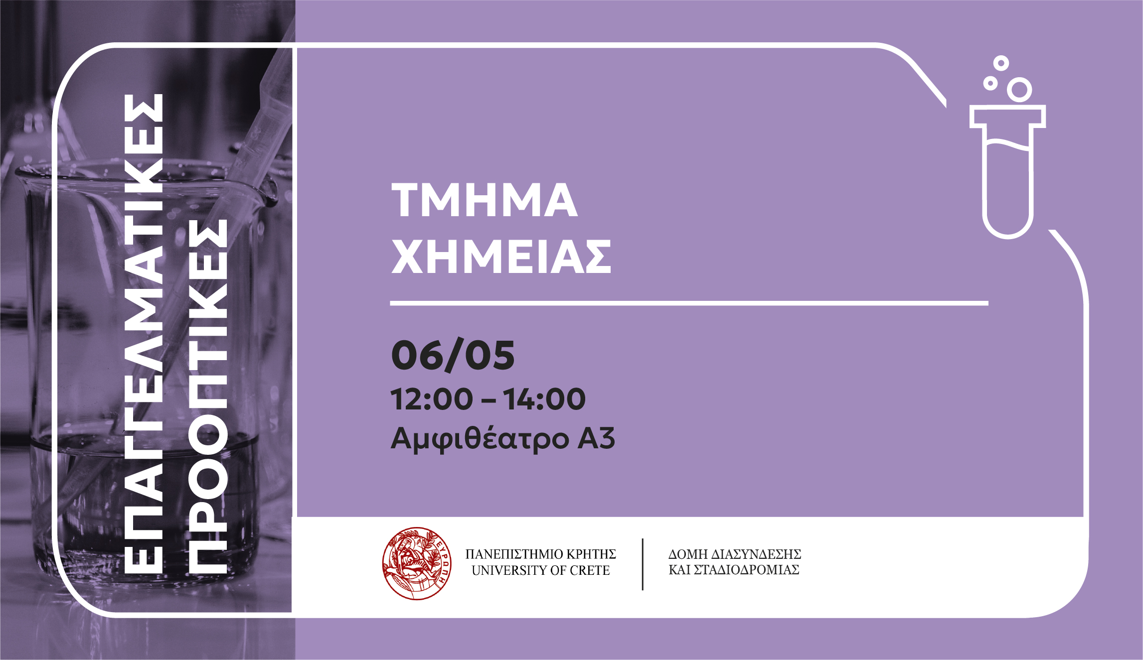 Το Τμήμα Χημείας και η Δομή Διασύνδεσης και Σταδιοδρομίας του Πανεπιστημίου Κρήτης σας προσκαλούν σε εκδήλωση με θέμα τις επαγγελματικές προοπτικές των αποφοίτων του Τμήματος!