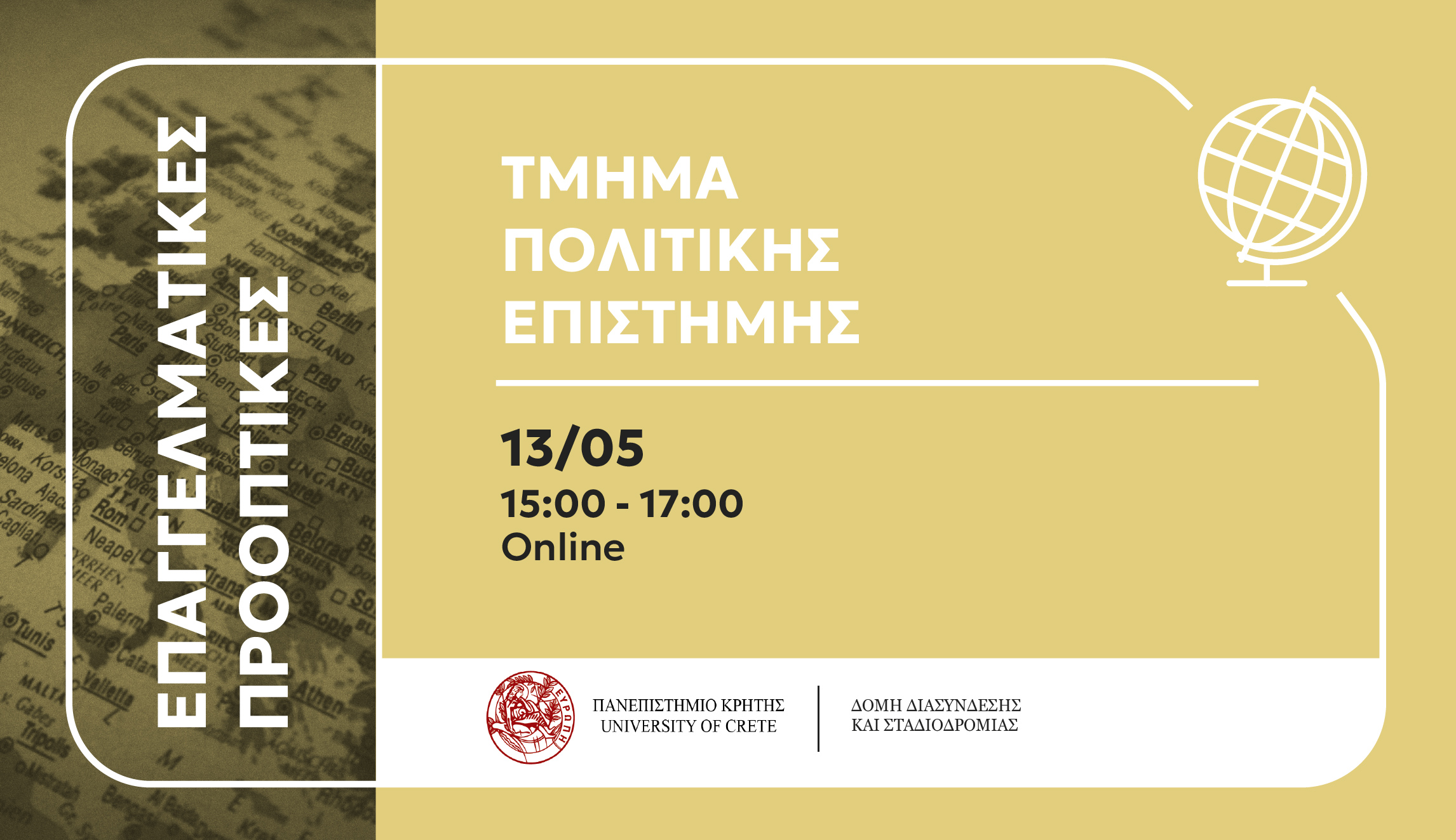 Το Τμήμα Πολιτικής Επιστήμης και η Δομή Διασύνδεσης και Σταδιοδρομίας του Πανεπιστημίου Κρήτης σας προσκαλούν σε διαδικτυακή εκδήλωση με θέμα τις επαγγελματικές προοπτικές των αποφοίτων του Τμήματος!