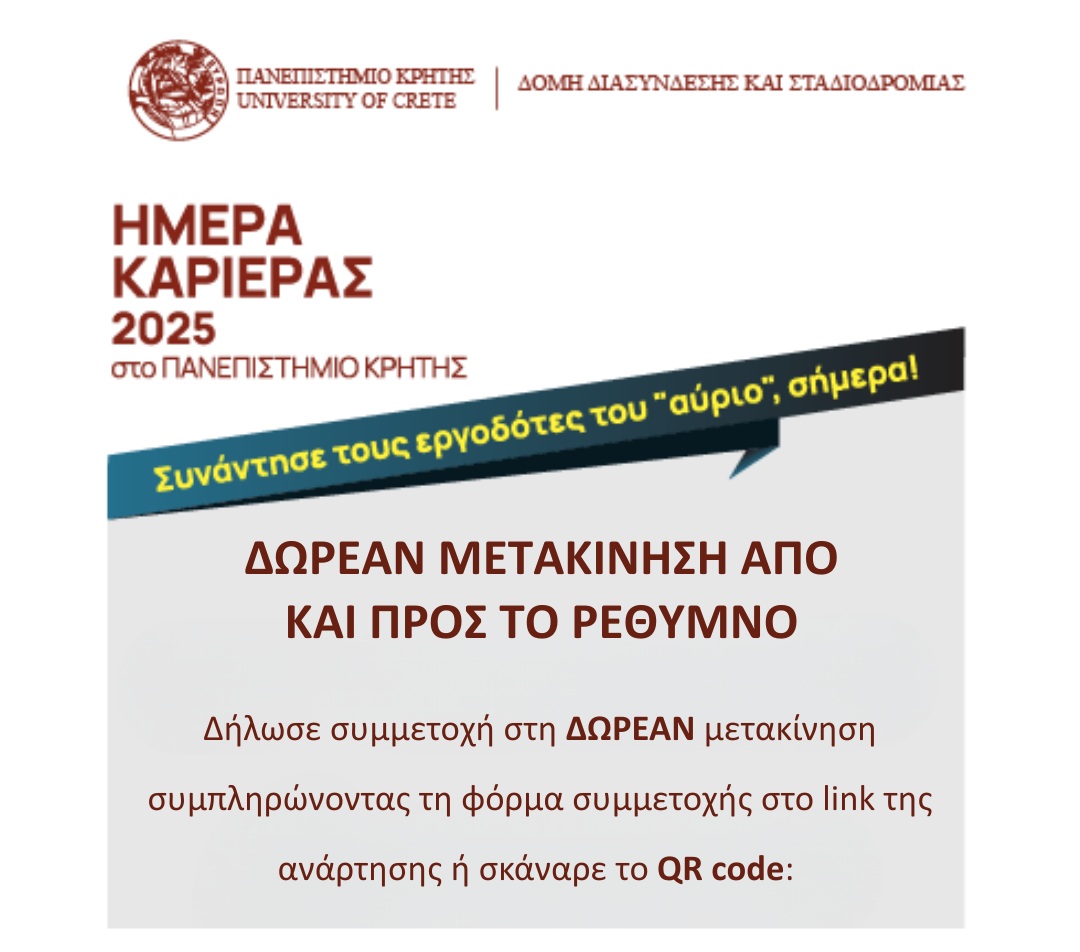 - Η Ημέρα Καριέρας θα πραγματοποιηθεί, όπως ήδη γνωρίζετε, την Παρασκευή 31 Οκτωβρίου 2025 (11:00 πμ.- 18:00 μμ.) στην Πανεπιστημιούπολη Βουτών, στο Ηράκλειο. Πιο συγκεκριμένα, την εκδήλωση θα φιλοξενήσουν στις εγκαταστάσεις τους, το Τμήμα Μαθηματικών & Εφαρμοσμένων Μαθηματικών και το Τμήμα Επιστήμης Υπολογιστών.